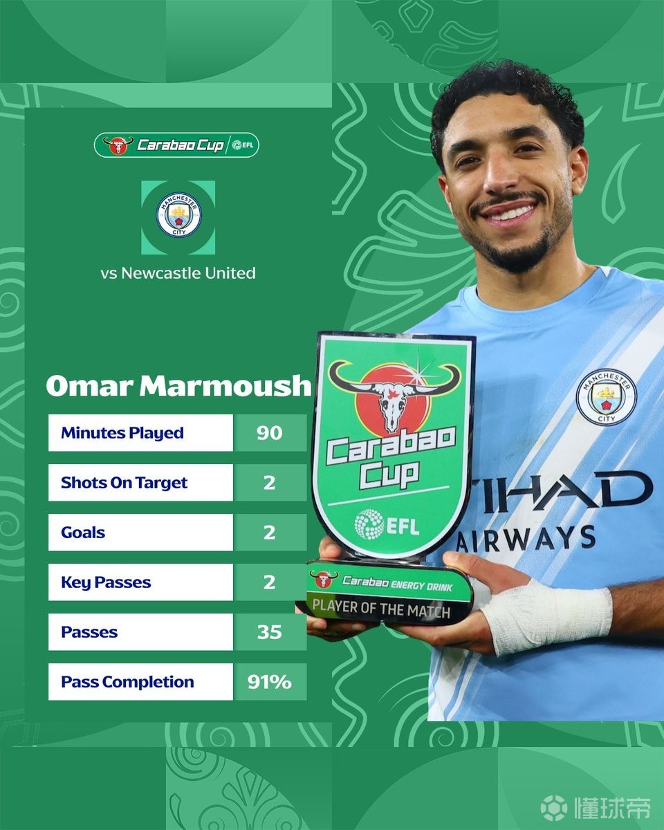 梅开二度,马尔穆什当选曼城vs纽卡全场最佳球员