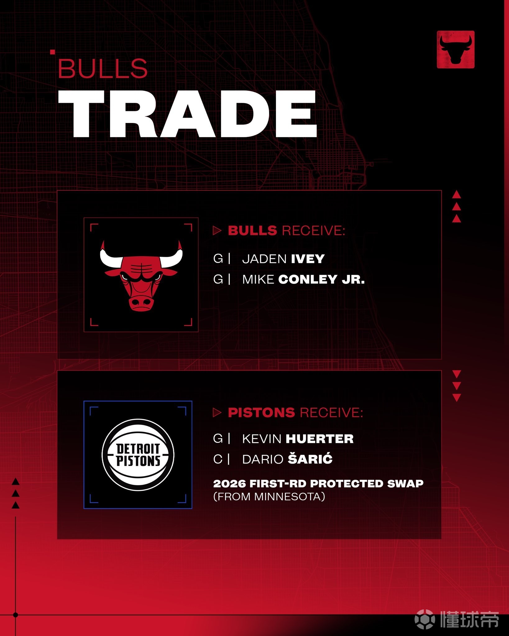 官方:公牛通过与活塞和森林狼的三方交易,得到艾维和康利
