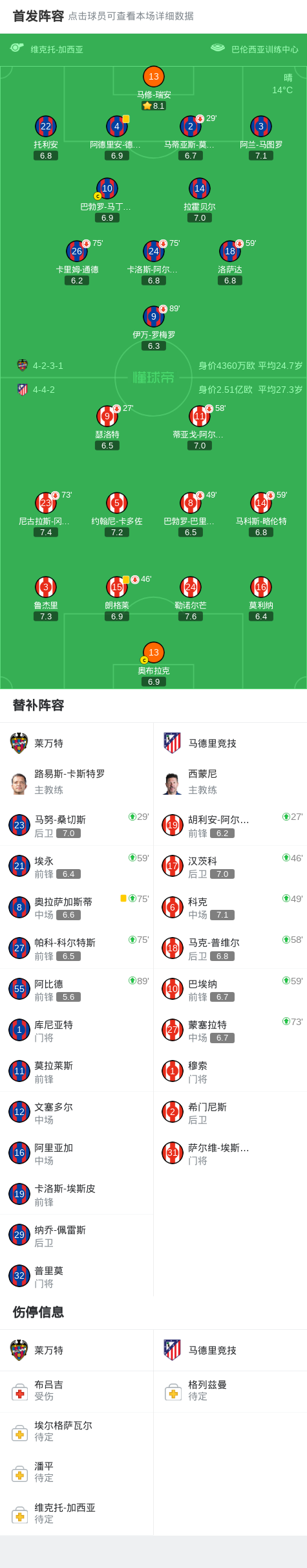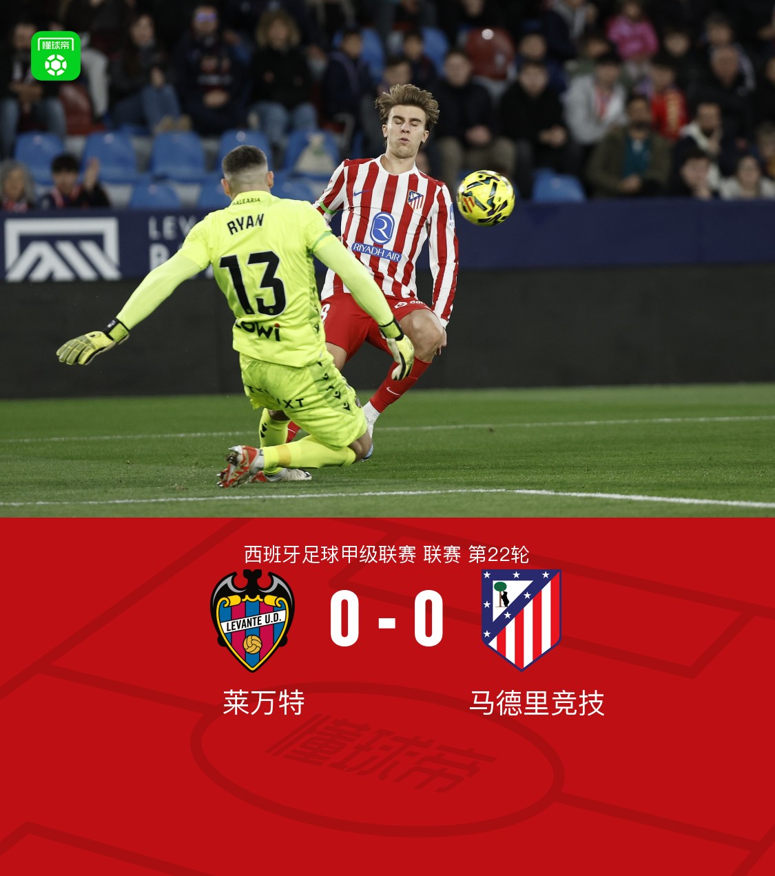 马竞客场0-0莱万特,瑟洛特伤退,胡利安-阿尔瓦雷斯头球造险