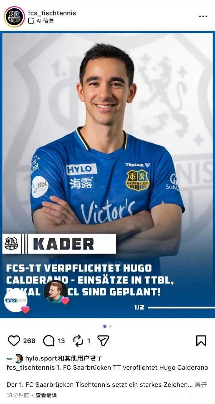 2月6日,巴西乒乓球名将雨果官宣加盟德甲萨尔布吕肯俱乐部,与樊振东成为队友。