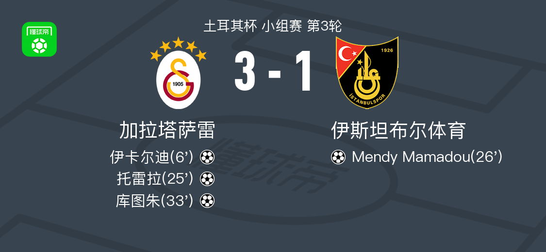 北京时间2月5日土耳其杯 小组赛 第3轮,加拉塔萨雷对阵伊斯坦布尔体育。加拉塔萨雷伊卡尔迪破门,托雷拉破门,库图朱破门。伊斯坦布尔体育Mendy Mamadou破门。最终比分加拉塔萨雷 3-1 伊斯坦堡士邦。